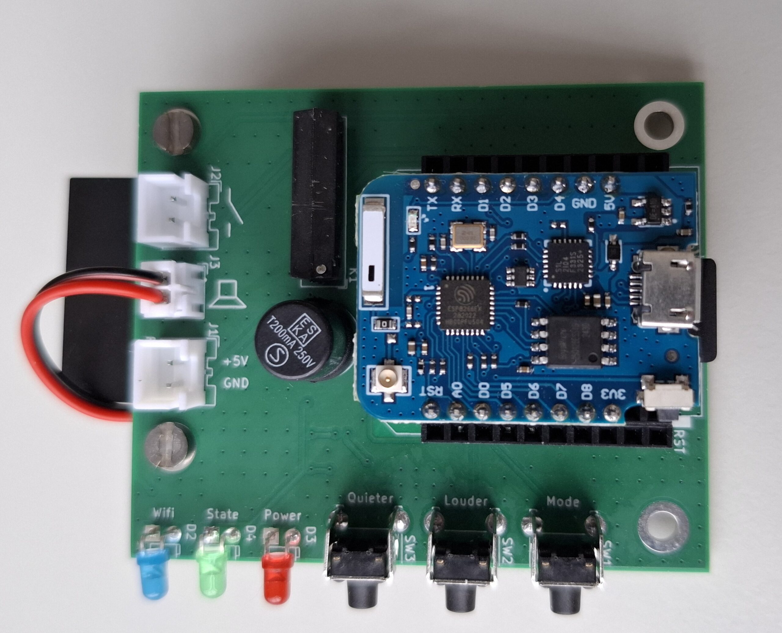 Für die Anzeige des Modulstatus sind drei 3 mm Led’s vorhanden sowie zwei Bedientasten Tasten für Lautstärke und eine Mode Taste.